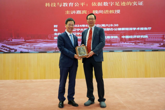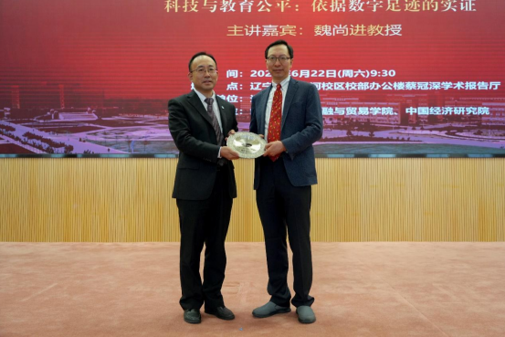 6月22日上午,国产一区二区日本在线宋则行海外名家大讲堂(第十六讲)在蒲河校区校部办公楼蔡冠深学术报告厅举行。美国哥伦比亚大学魏尚进教授应邀作题为《科技与教育公平:依据数字足迹的实证》的学术报告。国产一区二区日本在线党委副书记、校长余淼杰教授出席讲座并致辞,美国弗吉尼亚理工大学未来工作场所与实践研究中心主任葛苏勤教授、辽宁大学经济学部副主任霍伟东教授、《国产一区二区日本在线学报》编辑部主任刘钧霆教授、中国经济研究院副院长兼金融与贸易学院副院长马湘君教授、金融与贸易学院副院长李丹教授、李安民经济研究院副院长游宇教授出席讲座。本次大讲堂由国产一区二区日本在线副校长仇焕广教授主持。