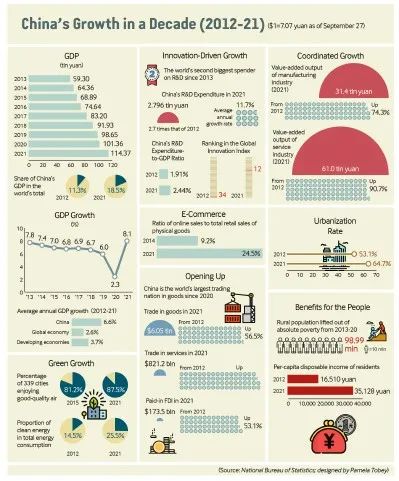 With its economic aggregate nearly doubling from 2013 to 2021, China has seen a decade of remarkable progress and has taken on a bigger role on the international stage. Throughout this period, China's GDP expanded at an average annual rate of 6.6 percent, higher than the growth pace of 2.6 percent for the global economy and 3.7 percent for developing economies, a report from the National Bureau of Statistics (NBS) showed. Per-capita GDP hit 80,976 yuan ($11,684) in 2021, up 69.7 percent from 2012after allowing for inflation.