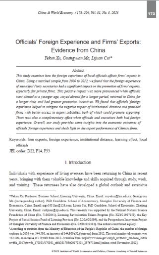 商学院徐业坤教授作为第一作者的合作论文Officialsforeign experience and firms’ exports: Evidence from China 2023年5月在国际期刊China & World Economy发表。