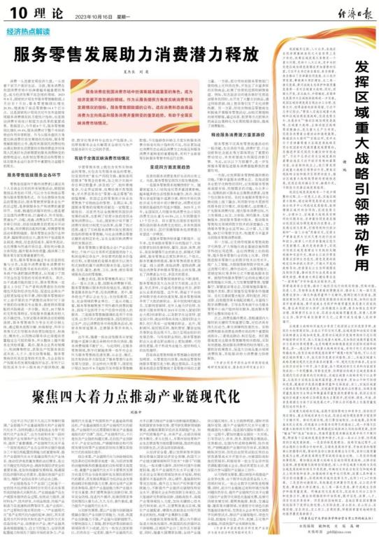 2023年10月16日,经济学院谢地教授在《经济日报》理论版发表题为“发挥区域重大战略引领带动作用”的署名文章。